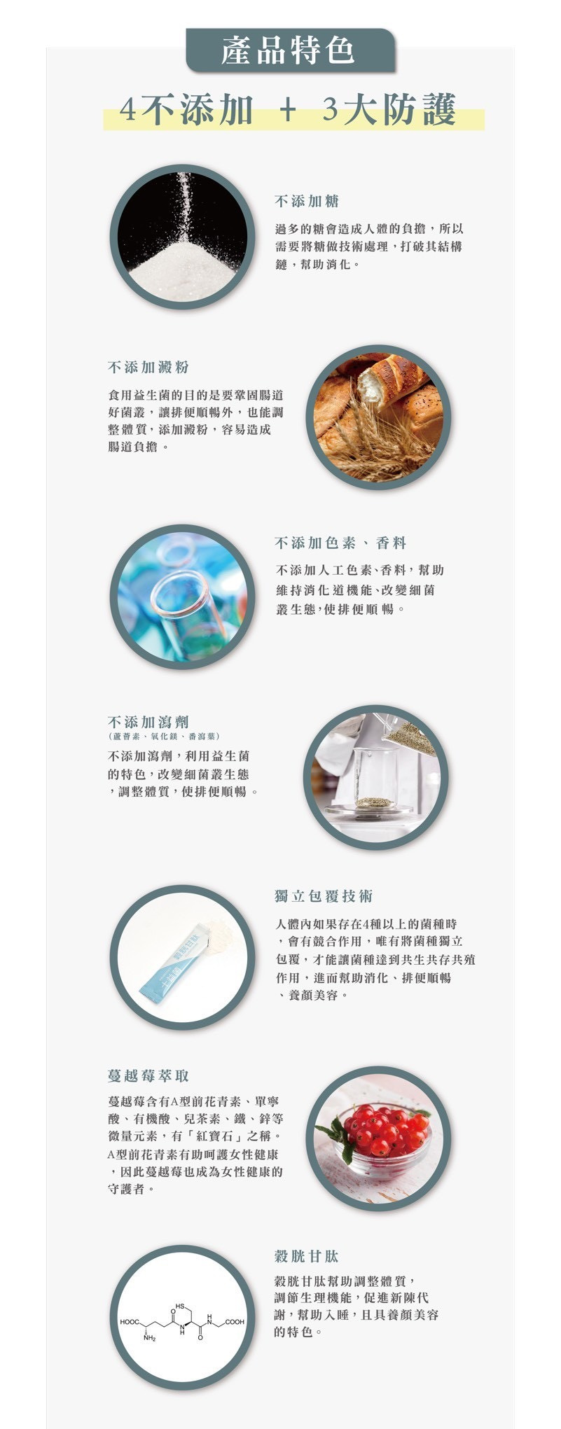 ◆主成分:乳酸菌、穀胱甘肽、鳯梨酵素、蔓越莓萃取物、優格粉規格 : ◆2g/包,45包/盒 ◆保存期限 : 2年 ◆有效日期 : 見包裝上標示 ◆建議用量 : 每次2包 ◆食用方法 : 早上空腹以及晚上睡前食用 ◆保存方法 : 請置於室溫陰涼乾燥處,避免潮濕、高溫或陽光直射,開封後請盡速食用完畢 ◆注意事項: ◎對穀胱甘肽過敏者、孕婦、哺乳婦女及嬰幼兒應避免食用 ◎重大疾病及服藥中者,請先徵詢醫師後再食用 本產品已投保產品責任險,保障消費者權益 ◆原產地 : 台灣
