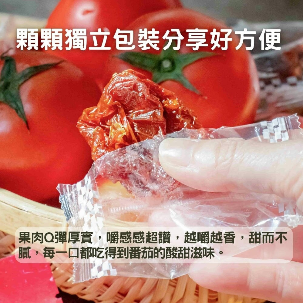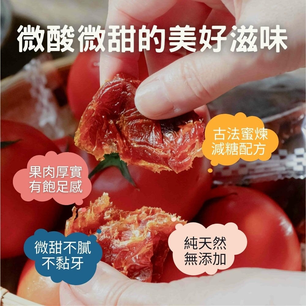 與市售番茄蜜餞不同,我們刻意減少糖分,讓你吃得出食材本身的酸甜層次,沒有過度甜膩感。