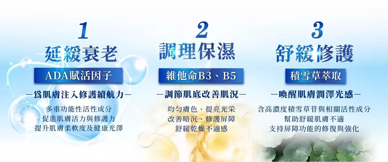 ▎主成份:酵母發酵萃取、米泔水發酵萃取、積雪草萃取、ADA賦活因子、維他命B3、維他命B5、玻尿酸