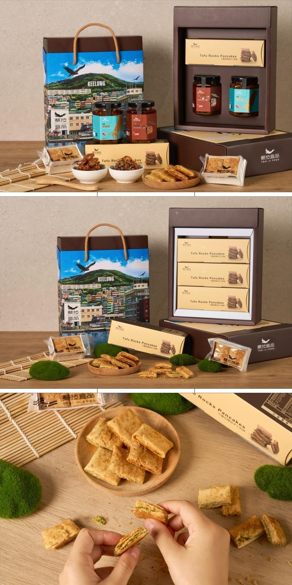 禮盒內容包含 千層豆腐岩手工煎餅、基隆鎖管醬 與 XO 干貝醬,