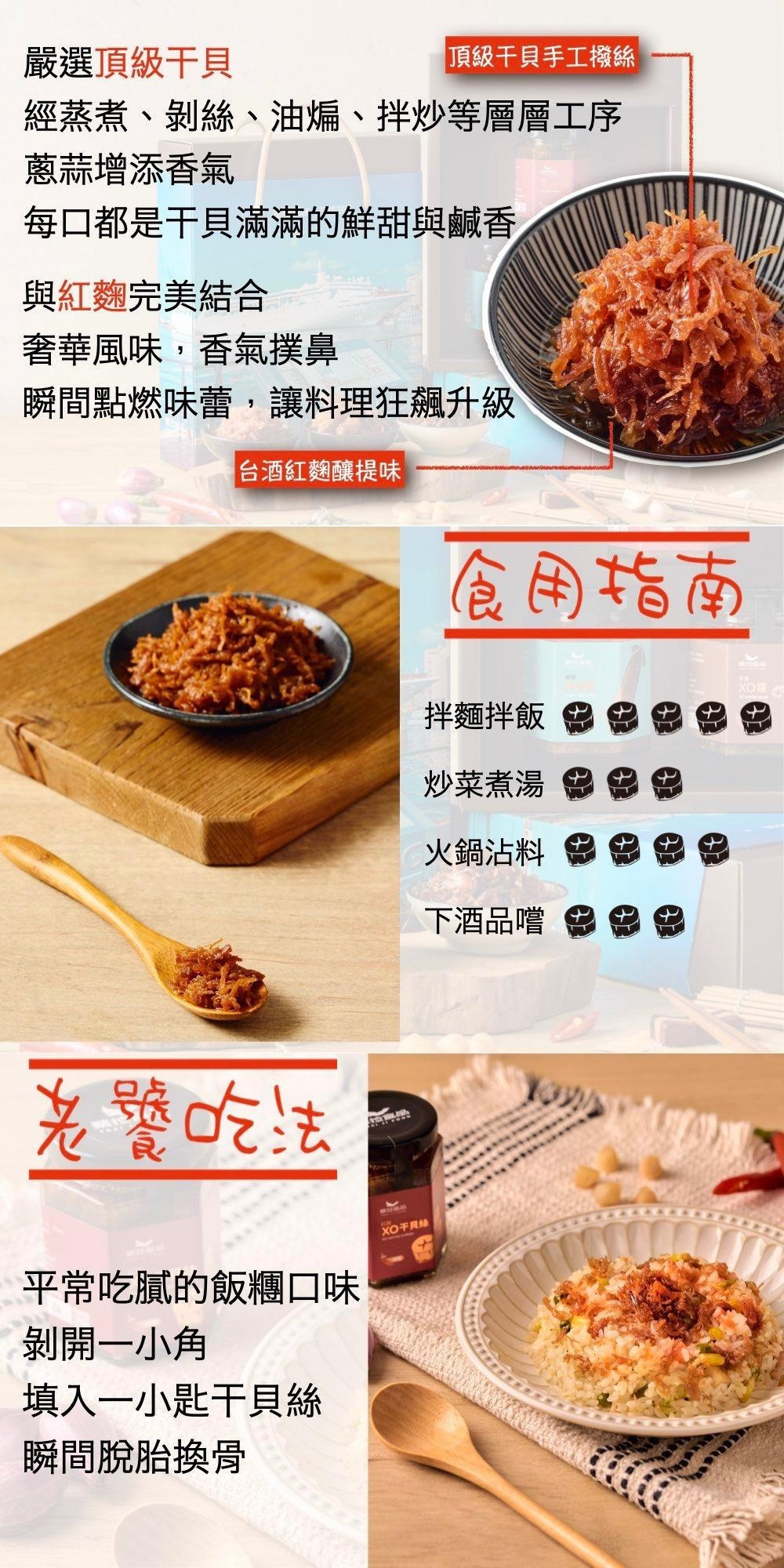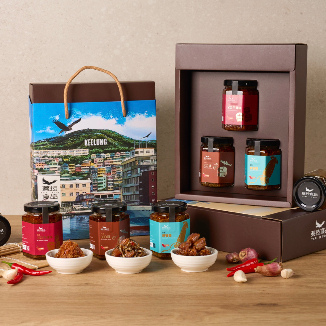 禮盒內容包含 基隆鎖管醬、XO 干貝醬 與 XO 干貝絲,