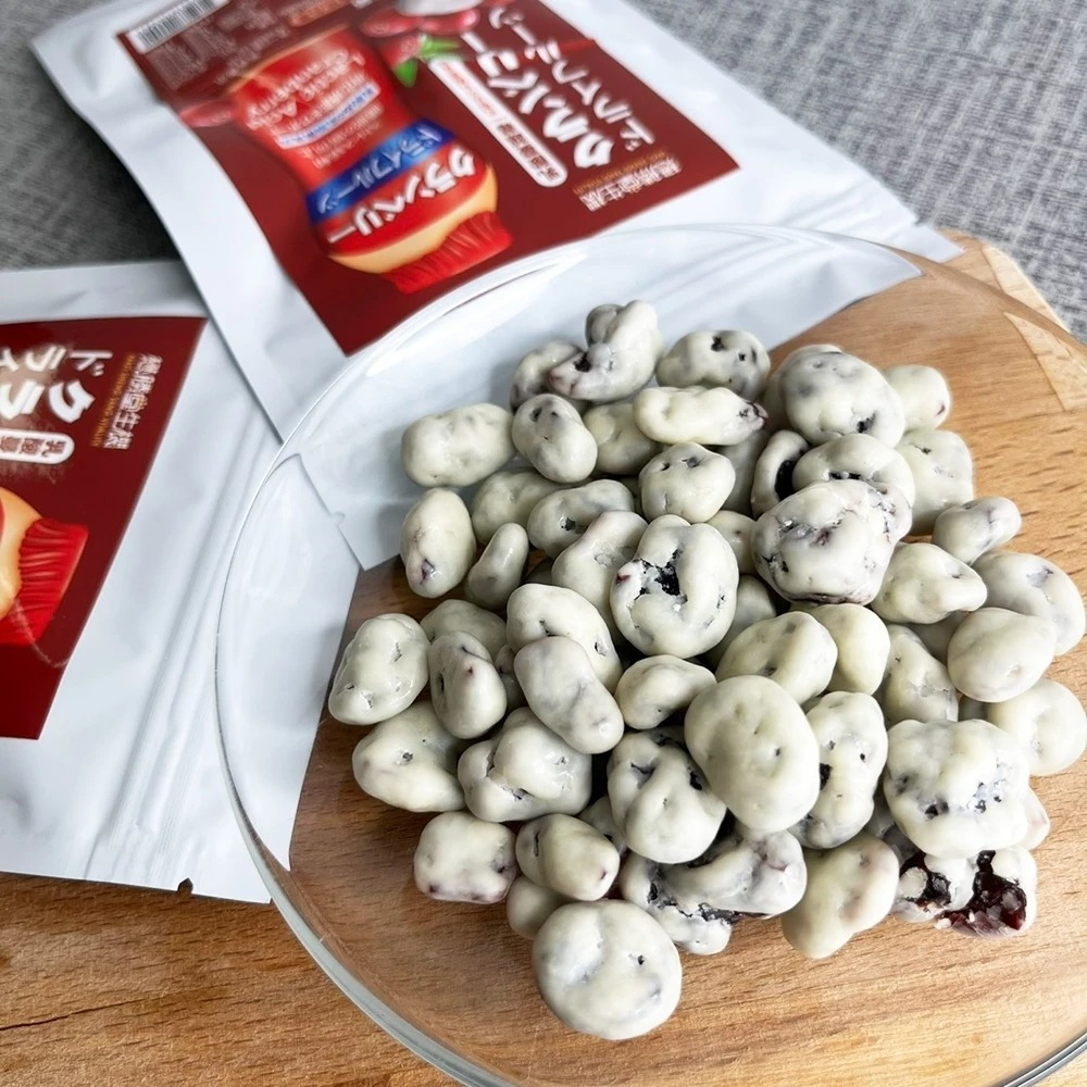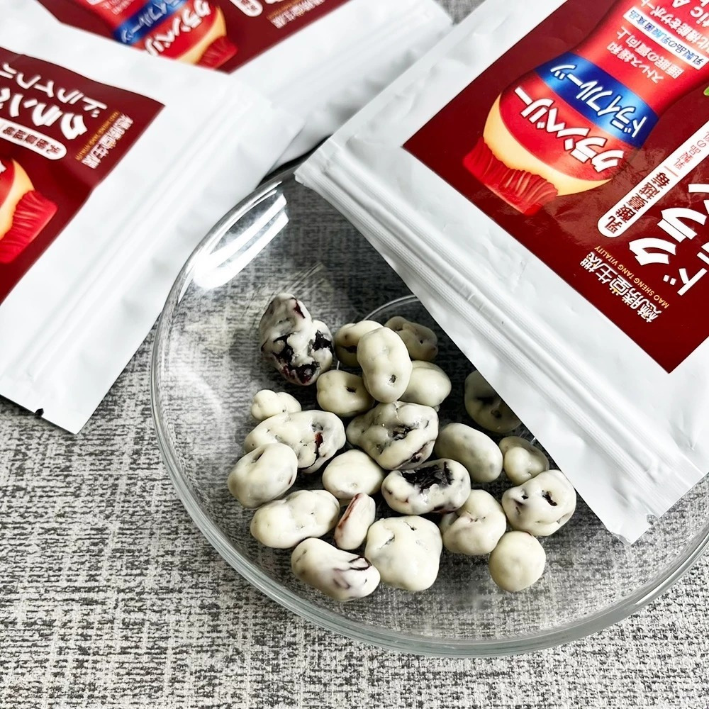 成份:蔓越莓、植物性油脂(完全氫化棕櫚核仁油)、砂糖、全脂奶粉、乳清粉、麥芽糊精、大豆卵磷脂、乳酸菌、阿拉伯膠、蟲膠、香料
