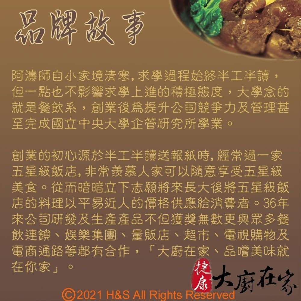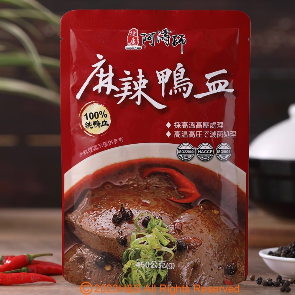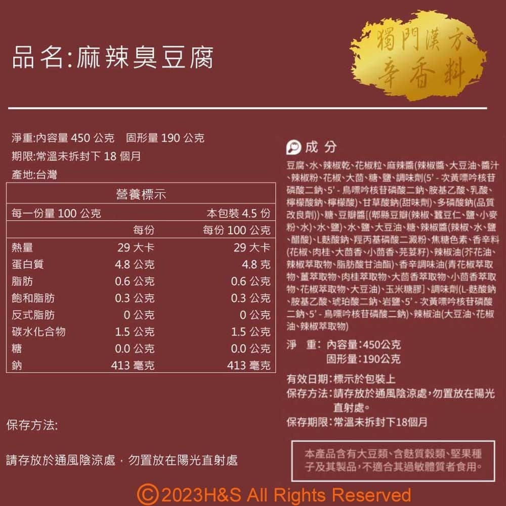 1.原產地:台灣 2.商品規格:淨重內容量:450公克、固形量:190公克/盒共2袋 3.商品主成份:(詳細成分如圖例) 《大廚在家》麻辣鴨血(450g) 鴨血(水、鴨血、鹽、多磷酸鈉、酸性焦磷酸鈉、矽樹脂、脂肪酸山梨醇酥醋、聚山梨醇酥脂肪酸酯六十五、羧甲基纖維素鈉、水、辣椒乾、花椒粒、麻辣醬(辣椒醬、大豆油醬汁、辣椒粉、花椒、大茴、糖、鹽、調味劑(5'-次黃嘌吟核昔磷酸二鈉、5'-鳥嘌吟核昔磷酸二鈉、胺基乙酸、乳酸、檸檬酸鈉檸檬酸)甘草酸鈉(甜味劑)、多磷酸鈉(品質改良劑糖、豆瓣醬[縣豆瓣(辣椒、蠶豆仁、鹽、小麥粉、水)、水、鹽]、水、鹽、大豆油、糖、辣椒醬(辣椒、水、鹽、醋酸、L酸鈉、經丙基磷酸二澱粉、焦糖色素、香辛料(花椒、肉桂、大茴香、小茴香、芫籽)、辣椒油(芥花油、辣椒萃取物、脂肪酸甘油酯)、香辛調味油(青花椒萃取物、萃取物、肉桂萃取物、大茴香萃取物、小茴香萃取物、花椒萃取物、大豆油玉米糖膠、雞粉(鹽、麥芽糊精、糖、玉米澱粉、雞肉粉(雞肉、迷迭香萃取物)、香料、酵母萃取物(酵母萃取物、鹽)、雞油(雞油、迷迭香萃取物)、棕櫚油、白胡椒辣椒油(大豆油、花椒油、辣椒萃取物) 《大廚在家》麻辣臭豆腐(450g) 豆腐、水、辣椒乾、花椒粒、麻辣醬(辣椒醬、大豆油、醬汁、辣椒粉、花椒、大茴、糖、鹽、調味劑(5'-次黃吟核磷酸二鈉.5'-鳥嘌吟核?磷酸二鈉、胺基乙酸、乳酸、檸檬酸鈉.檸檬酸)、甘草酸鈉(甜味劑)、多磷酸鈉(品質改良劑)糖、豆瓣醬[縣豆瓣(辣椒、蠶豆仁、鹽、小麥粉、水水、鹽]水鹽、大豆油、糖、辣椒醬(辣椒、水、鹽、醋酸)、酸鈉、經丙基磷酸二澱粉、焦糖色素、香辛料(花椒、肉桂、大茴香、小茴香、芫荽籽)、辣椒油(芥花油、辣椒萃取物、脂肪酸甘油酯香辛調味油(青花椒萃取物、萃取物、肉桂萃取物、大茴香萃取物、小茴香萃取物、花椒萃取物、大豆油玉米糖膠、雞粉(鹽、麥芽糊精、糖、玉米澱粉、雞肉粉(雞肉、迷迭香萃取物)、香料、酵母萃取物(酵母萃取物、鹽)、雞油(雞油、迷迭香萃取物)、棕櫚油、白胡椒)、辣椒油(大豆油、花椒油、辣椒萃取物) 4.保存期限:18個月(以消費者收受日算起,至少距有效日期135日以上) 5.廠商名稱:瀚軒國際貿易有限公司 6.廠商電話:02-82451347 7.廠商地址:新北市中和區中正路218-7號14樓 8.保險字號:泰安產物07字第162209A00068號 9.食品業者登錄字號:F-124728184-00000-9