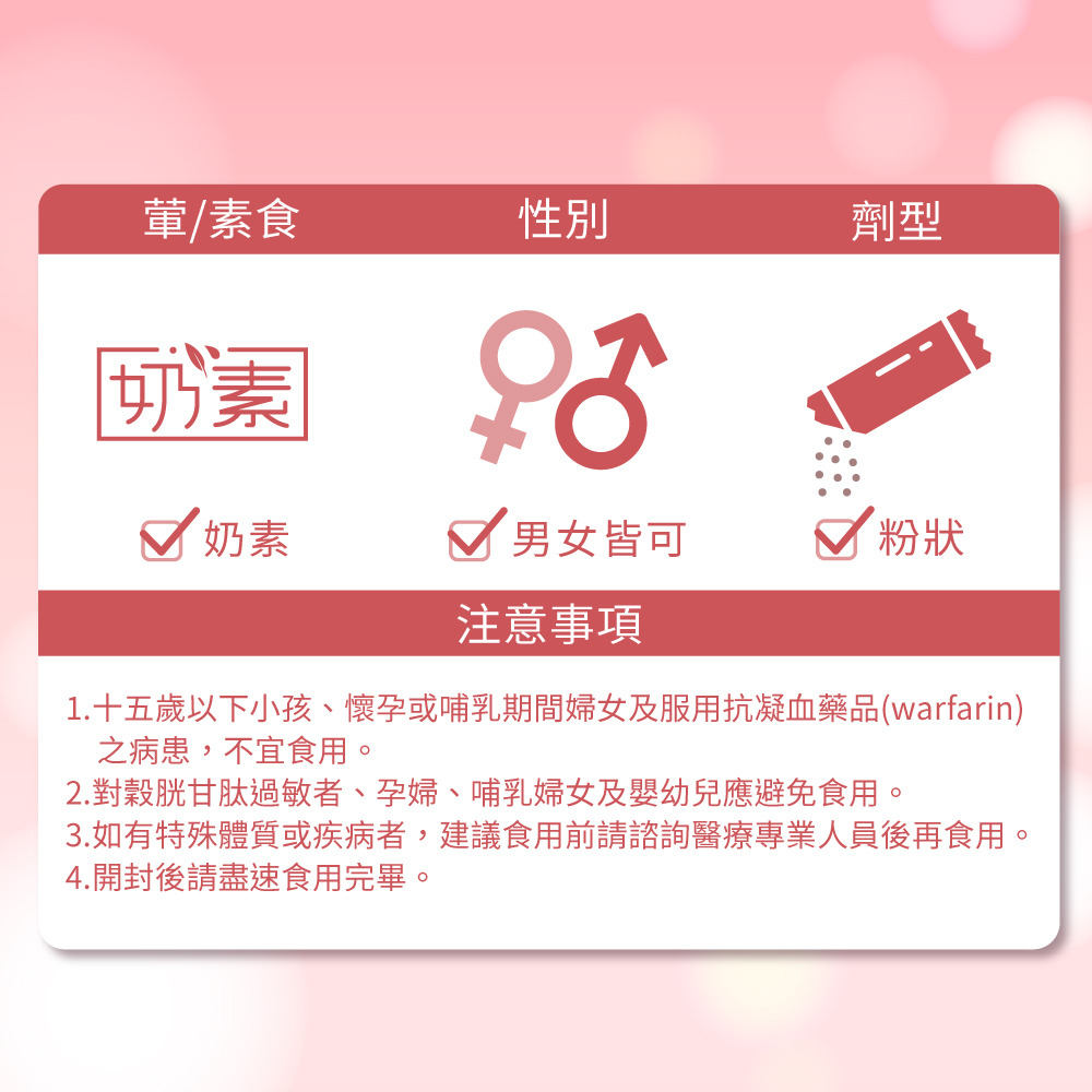 備註欄:●本產品含有黃豆、牛奶及其製品(乳糖、黑天使奶茶粉、牛乳清蛋白萃取物(含燕窩酸)。 ●對穀胱甘肽過敏者、孕婦、哺乳婦女及嬰幼兒應避免食用。 ●每日1次,每次1包。