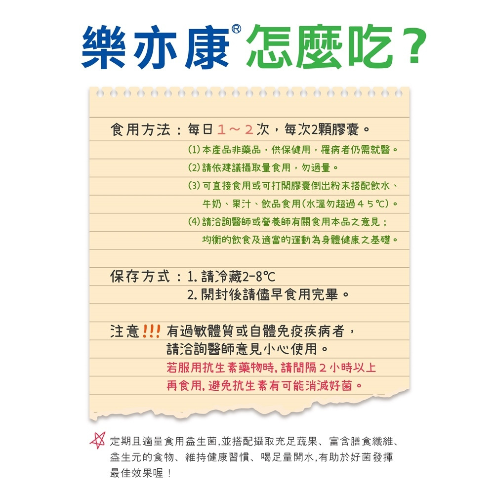 備註欄:1.本產品非藥品,供保健用,罹病者仍需就醫。 2.請依建議攝取量食用,勿過量。 3.可直接食用或可打開膠囊倒出粉末搭配飲水、牛奶、果汁、飲品食用。 4.請洽詢醫生或營養師有關食用本品之意見;均衡的飲食及適當的運動為身體健康之基礎。 【警語】有過敏體質或自體免疫疾病者,請洽詢醫生意見小心使用。