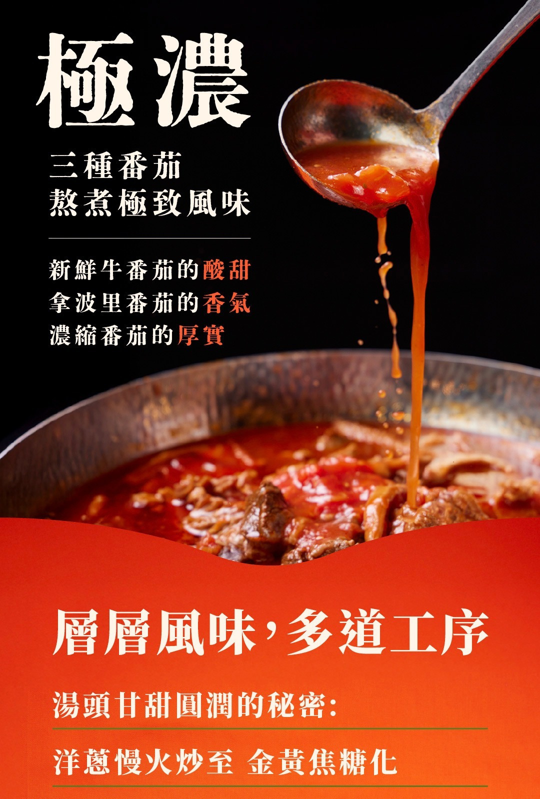 ● 三種番茄慢火熬煮,酸香濃厚、湯底層次飽滿