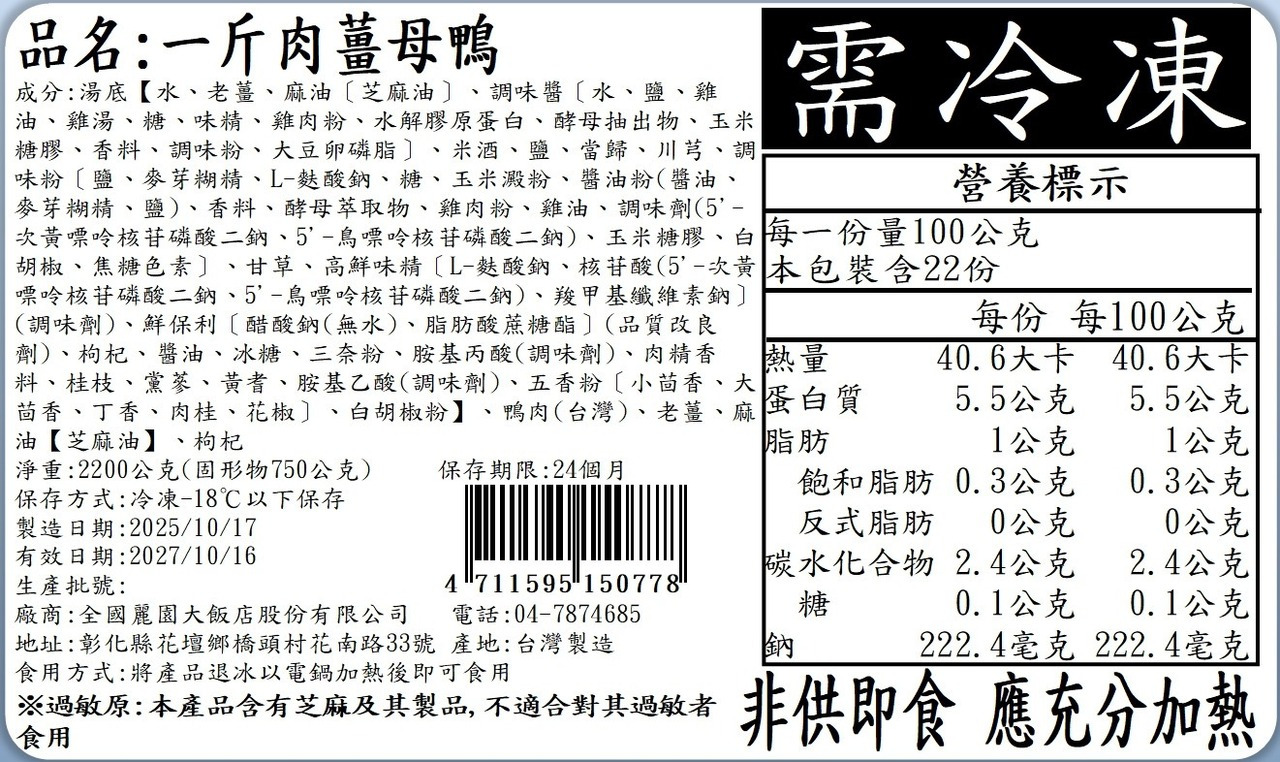 4.內容物成分(如含有豬、牛成分請加註國別):鴨肉、老薑、雞湯、米酒、當歸、川芎、甘草、枸杞、冰糖