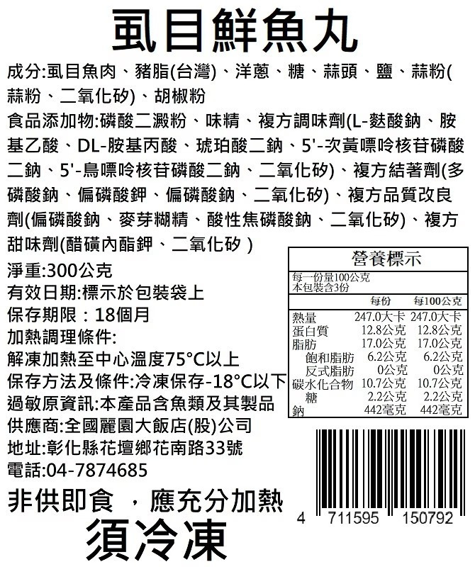 1.商品組合/規格:一入組 2.商品品名:虱目鮮魚丸 3.商品重(容)量:300公克 4.食品添加物名稱:詳見包裝圖 5.原產地(國):台灣 6.製造廠商或國內負責廠商名稱:全國麗園大飯店股份有限公司 7.製造廠商或國內負責廠商地址:彰化縣花壇鄉花南路33號 8.製造廠商或國內負責廠商電話:04-7874685 9.食品業者登錄字號:N-154524145-00000-1 10.投保產品責任險字號:1842-24PR0000661 ※過敏原資訊:本產品含魚類及其製品,不適合其過敏體質者食用。