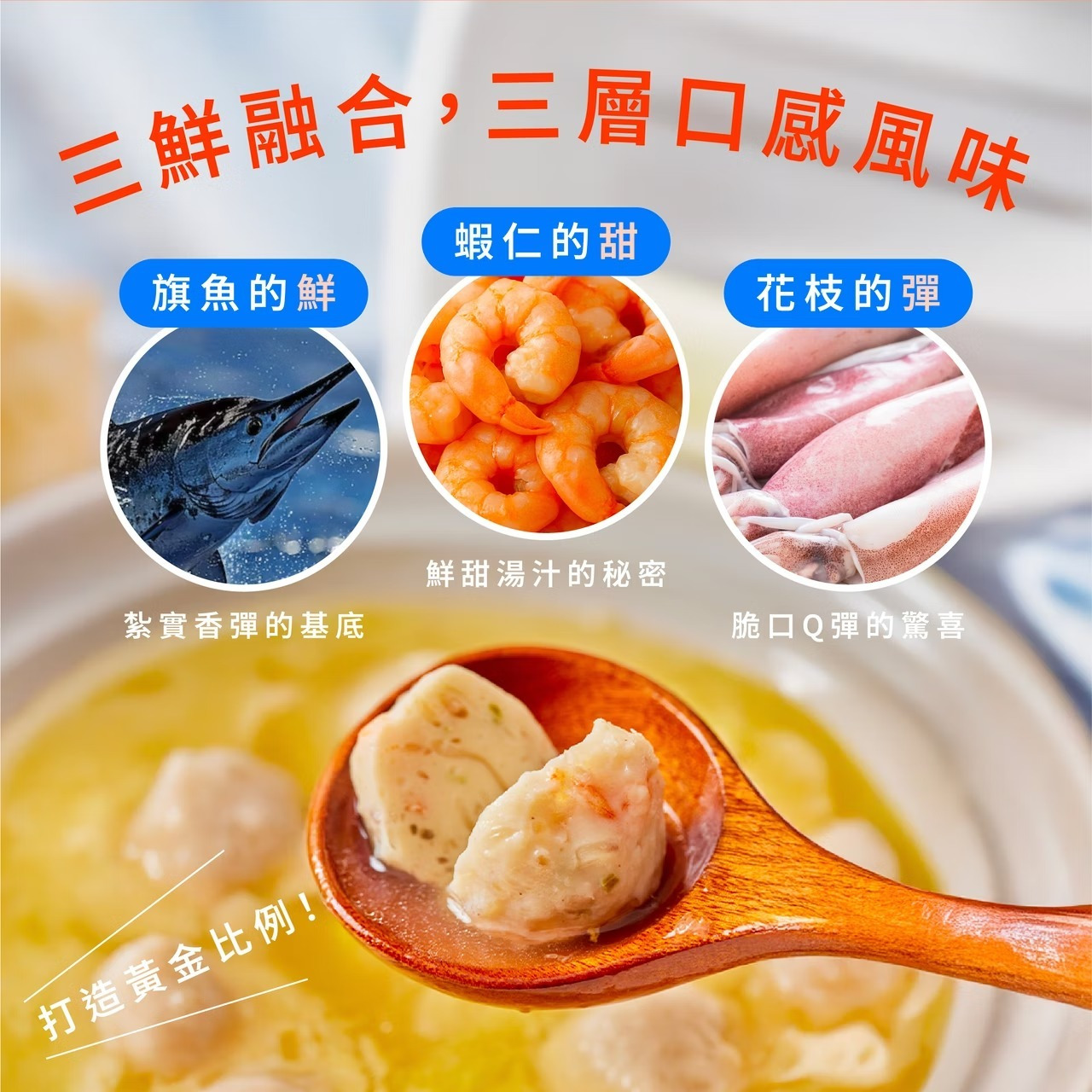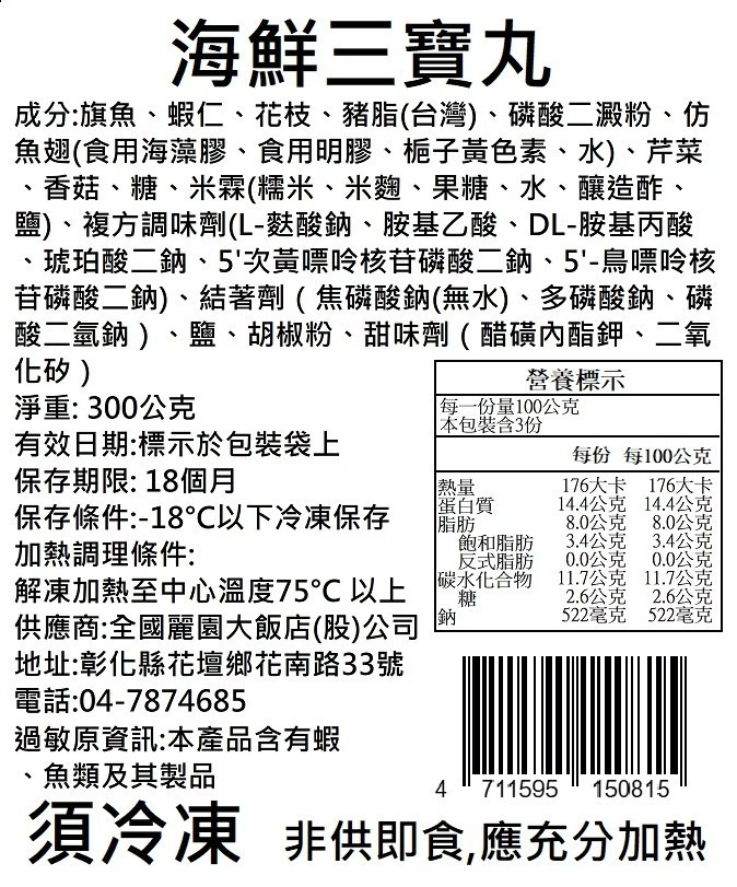 1.商品組合/規格:一入組 2.商品品名:海鮮三寶丸 3.商品重(容)量:300公克 4.食品添加物名稱:詳見包裝圖 5.原產地(國):台灣 6.製造廠商或國內負責廠商名稱:全國麗園大飯店股份有限公司 7.製造廠商或國內負責廠商地址:彰化縣花壇鄉花南路33號 8.製造廠商或國內負責廠商電話:04-7874685 9.食品業者登錄字號:N-154524145-00000-1 10.投保產品責任險字號:1842-24PR0000661 ※過敏原資訊:本產品含有蝦、魚類及其製品,不適合其過敏體質者食用。