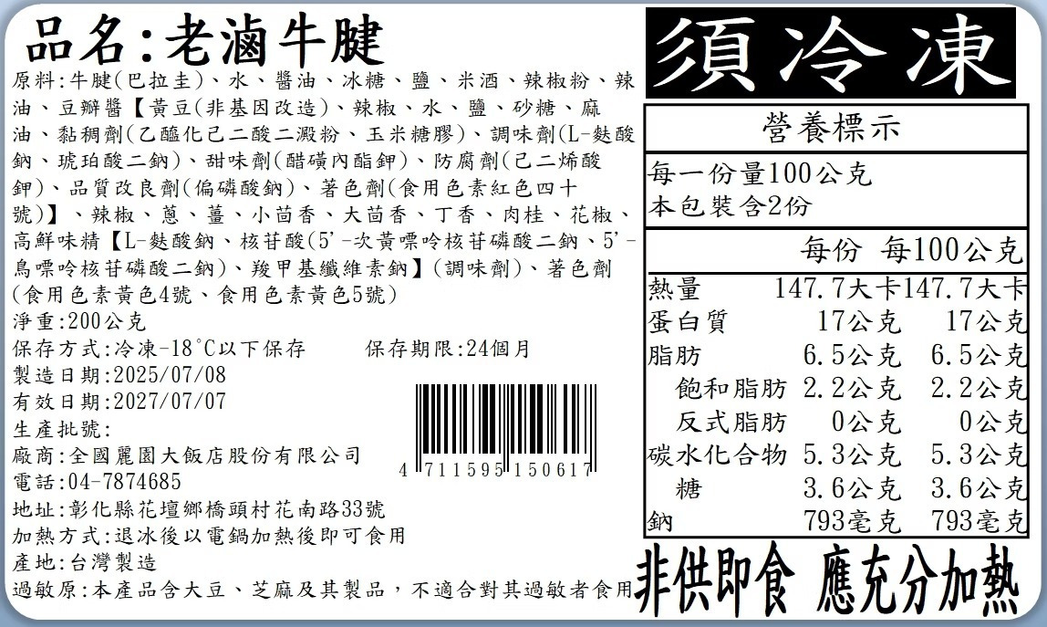 1.商品組合/規格:一入組 2.商品品名:老滷牛腱 3.商品重(容)量:200公克 4.食品添加物名稱:詳見包裝圖 5.原產地(國):台灣 6.製造廠商或國內負責廠商名稱:全國麗園大飯店股份有限公司 7.製造廠商或國內負責廠商地址:彰化縣花壇鄉花南路33號 8.製造廠商或國內負責廠商電話:04-7874685 9.食品業者登錄字號:N-154524145-00000-1 10.投保產品責任險字號:1842-24PR0000661 ※過敏原資訊:本產品含大豆、芝麻及其製品,不適合對其過敏者食用