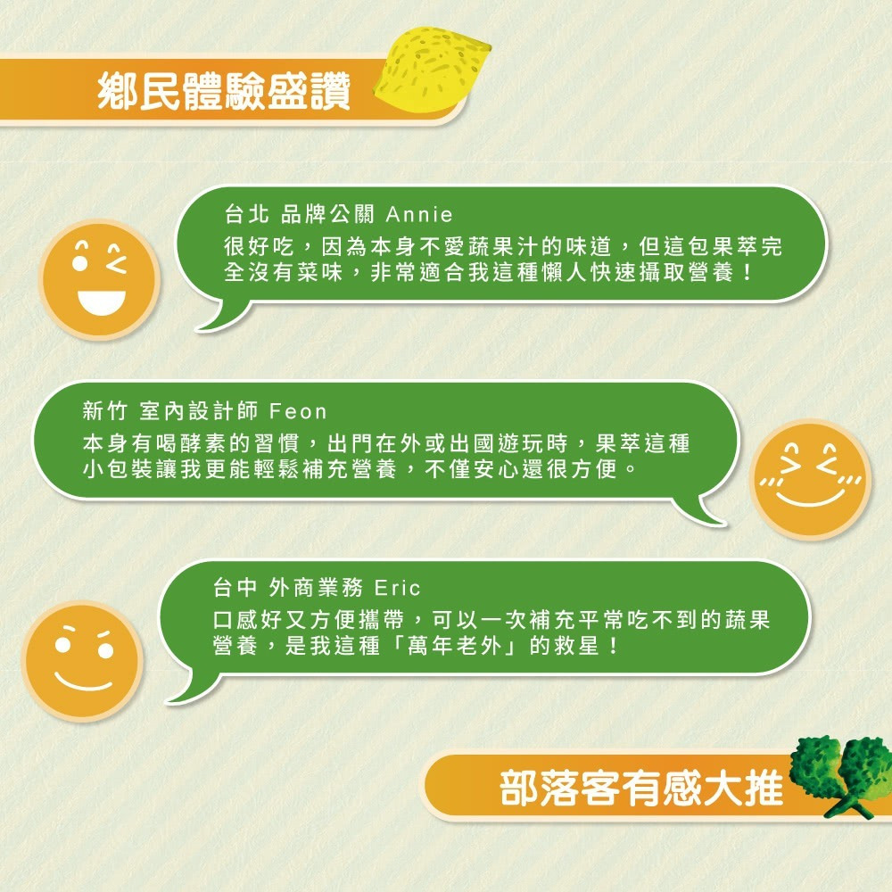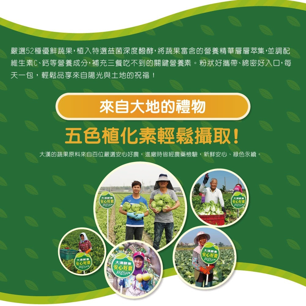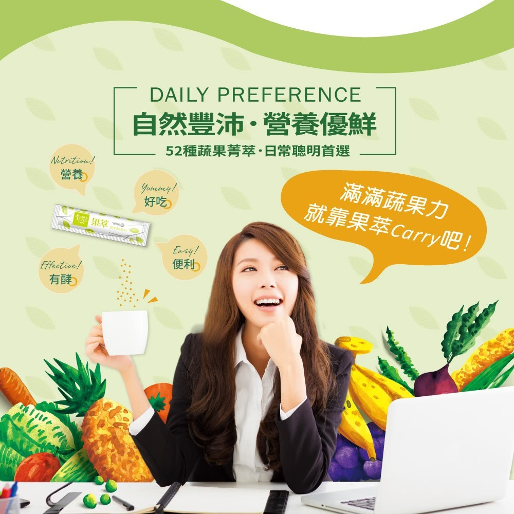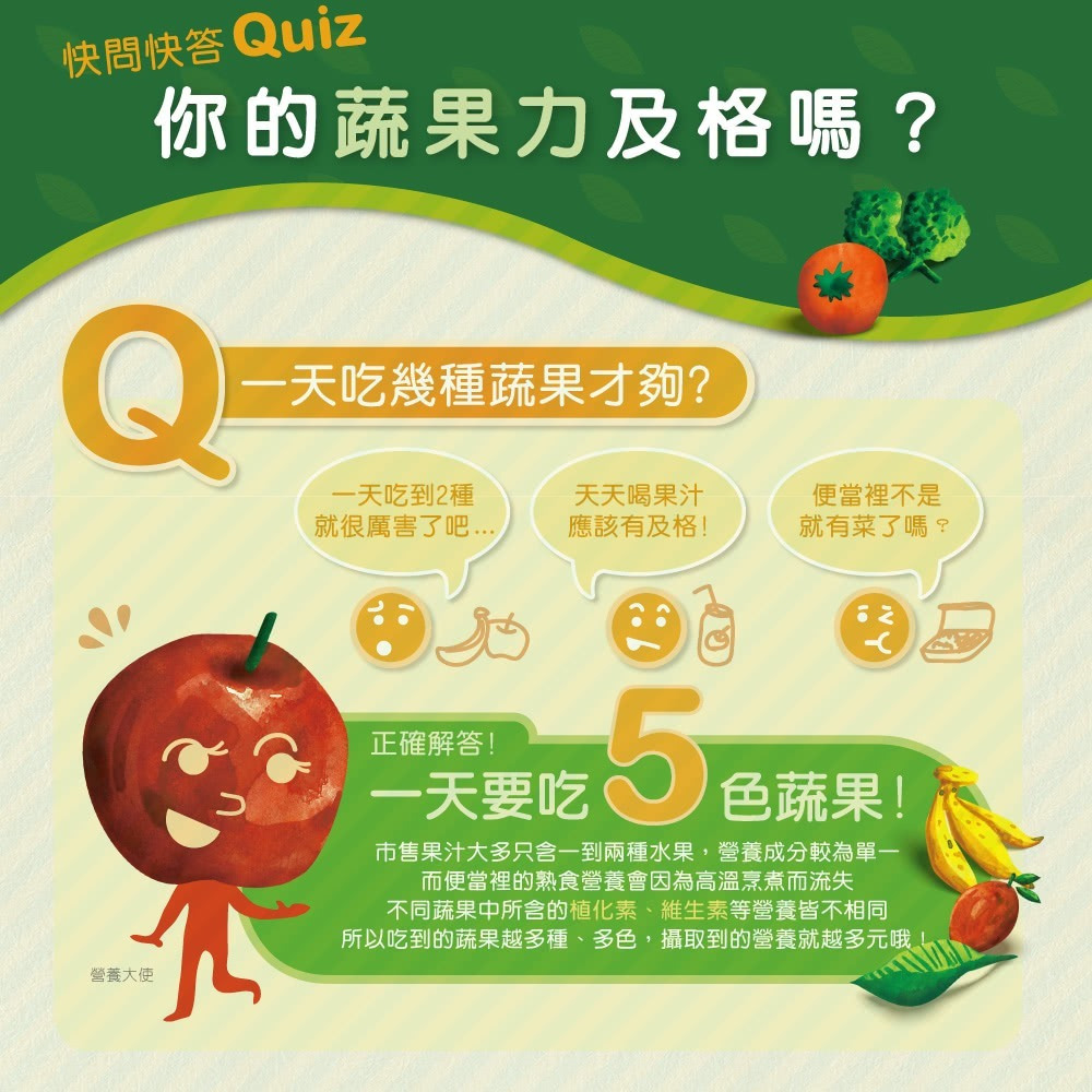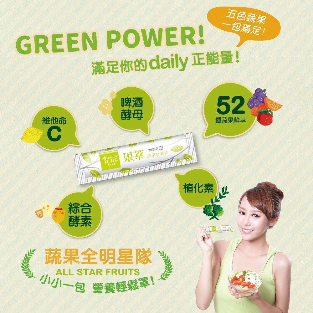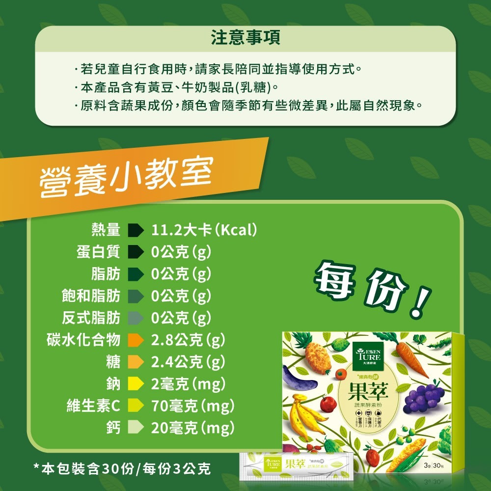 內容物名稱(成分):蔬果植物醱酵乾燥粉末(異麥芽寡糖粉、麥芽糊精、小松葉、銀耳、山藥、番茄、南瓜、甘藍、梅子、番薯、花椰菜、檸檬、鳳梨、小白菜、哈密瓜、芹菜、生薑、木瓜、芥菜、冬瓜、芥藍、黃豆、西瓜、金桔、青椒、青江菜、隼人瓜、薏仁、瓠瓜、蕪菁、蘋果、楊桃、青花菜、葡萄柚、馬鈴薯、蘿蔔、水梨、甜瓜、甜椒、苦瓜、胡蘿蔔、番石榴、空心菜、番薯葉、絲瓜、菠菜、萵苣、葡萄、黃瓜、蓮霧、蘆筍、木薯、印度棗、酪梨)、乳糖、難消化性麥芽糊精、特砂、柳橙果汁粉(砂糖、柳橙果汁粉(柳橙濃縮汁、麥芽糊精、辛烯基丁二酸鈉澱粉)、辛烯基丁二酸鈉澱粉、檸檬酸、檸檬酸鈉、玉米澱粉、蘋果酸、橘子香料(含橘子油)、β-胡蘿蔔素(麥芽糊精、阿拉伯膠、中鏈三酸甘油酯、蔗糖、L-抗壞血酸鈉(抗氧化劑)、β-胡蘿蔔素、二氧化矽、生育醇(維生素E)(抗氧化劑)))、百香果果汁粉(砂糖、麥芽糊精、百香果汁、檸檬酸、檸檬酸鈉、香料、β-胡蘿蔔素)、維生素C、碳酸鈣、糖蜜酵母粉(啤酒酵母)、綜合酵素(蛋白質酵素、麥芽糊精、澱粉酵素、糖化酵素、脂解酵素、轉化酵素、鳳梨酵素、纖維素分解酵素)、蘋果酸。