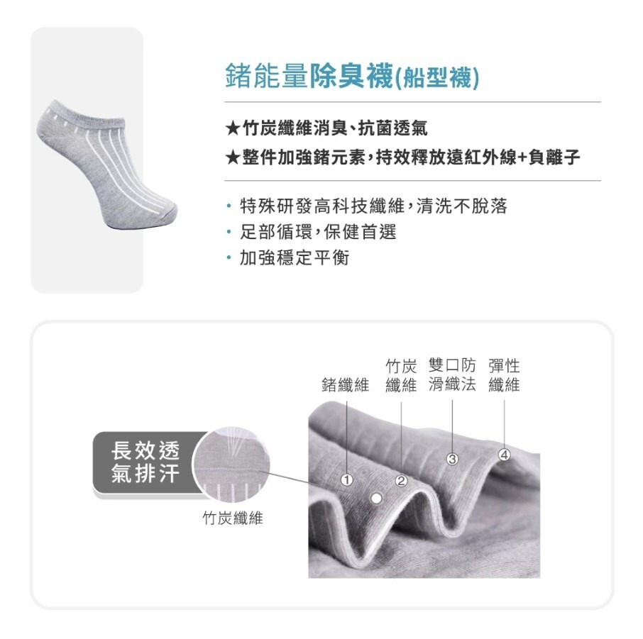 商品注意事項:此為個人衛生用品,ㄧ經拆封使用,恕不退換。 成份: 鍺纖維22%、縲縈紗35%、竹炭纖維40%, 萊卡彈性紗3%。尺寸:均碼 款式:船型襪 內容物:1雙入(兩只),此為6雙組 使用方式 : 正常穿著於雙腳,可24小時穿著。 產地: 台灣 委託製造:麗馥生醫科技有限公司 電 話:0800-333-036 地址:台北市中山區中山北路二段112號8樓之3