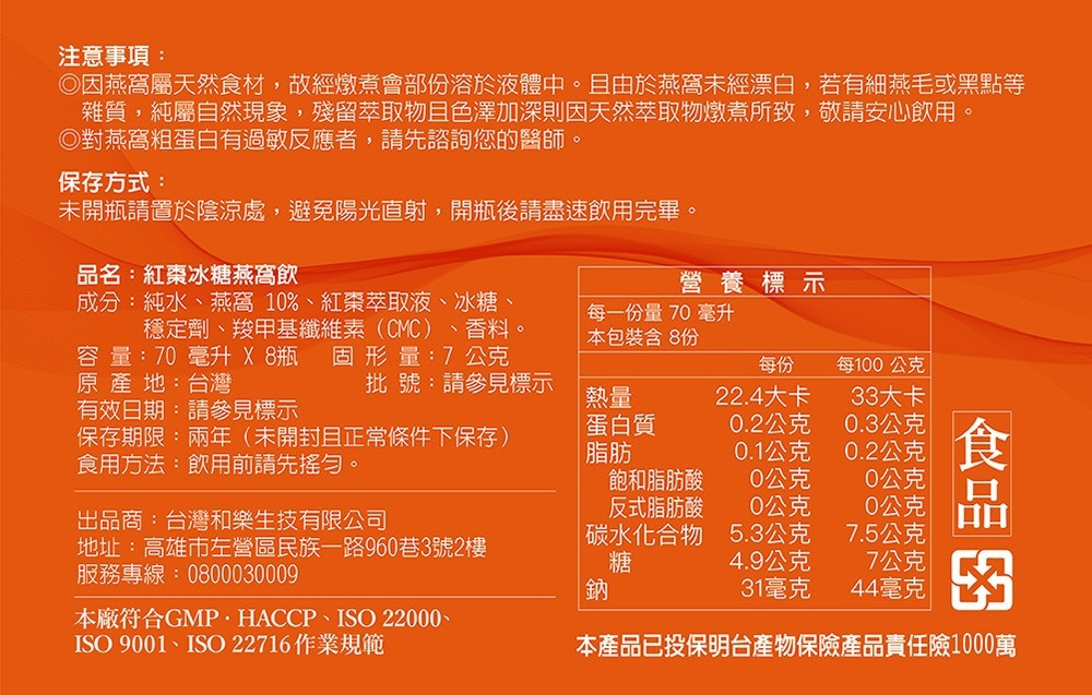 備註欄:對燕窩粗蛋白有過敏反應者,請先諮詢您的醫師。
