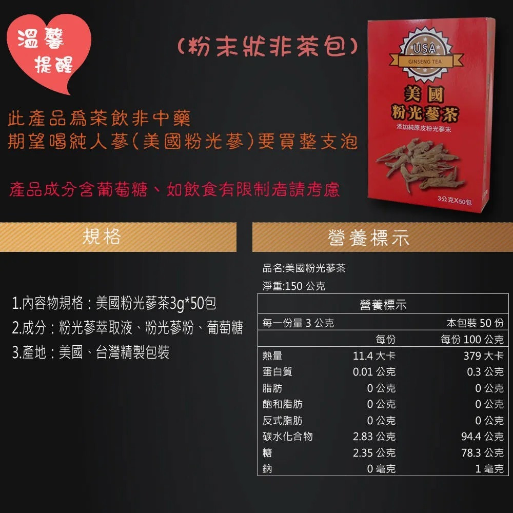 1.內容物規格:美國粉光蔘茶3g*50包/盒共2盒 2.成分:粉光蔘萃取液、西洋蔘粉、葡萄糖 3.產地:美國、台灣精製包裝 4.廠商:瀚軒國際貿易有限公司 5.廠商電話:02-82451347 6.廠商地址:新北市中和區中正路218-7號14樓 7.保存期限:2年 8.本產品已投保責任險:新光產物保險字號:1300-06AKP0000794 9.食品業者登錄字號:F-124728184-00000-9