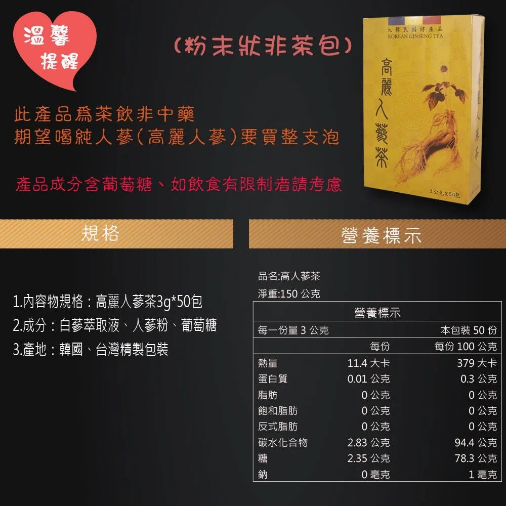 1.內容物規格:高麗人蔘茶3g*50包/盒共2盒 2.成分:白蔘萃取液、人蔘粉、葡萄糖 3.產地:韓國、台灣精製包裝 4.廠商電話:02-82451347 5.廠商地址:新北市中和區中正路218-7號14樓 6.保存期限:2年 7.本產品已投保責任險:新光產物保險字號:1300-06AKP0000794 8.食品業者登錄字號:F-124728184-00000-9