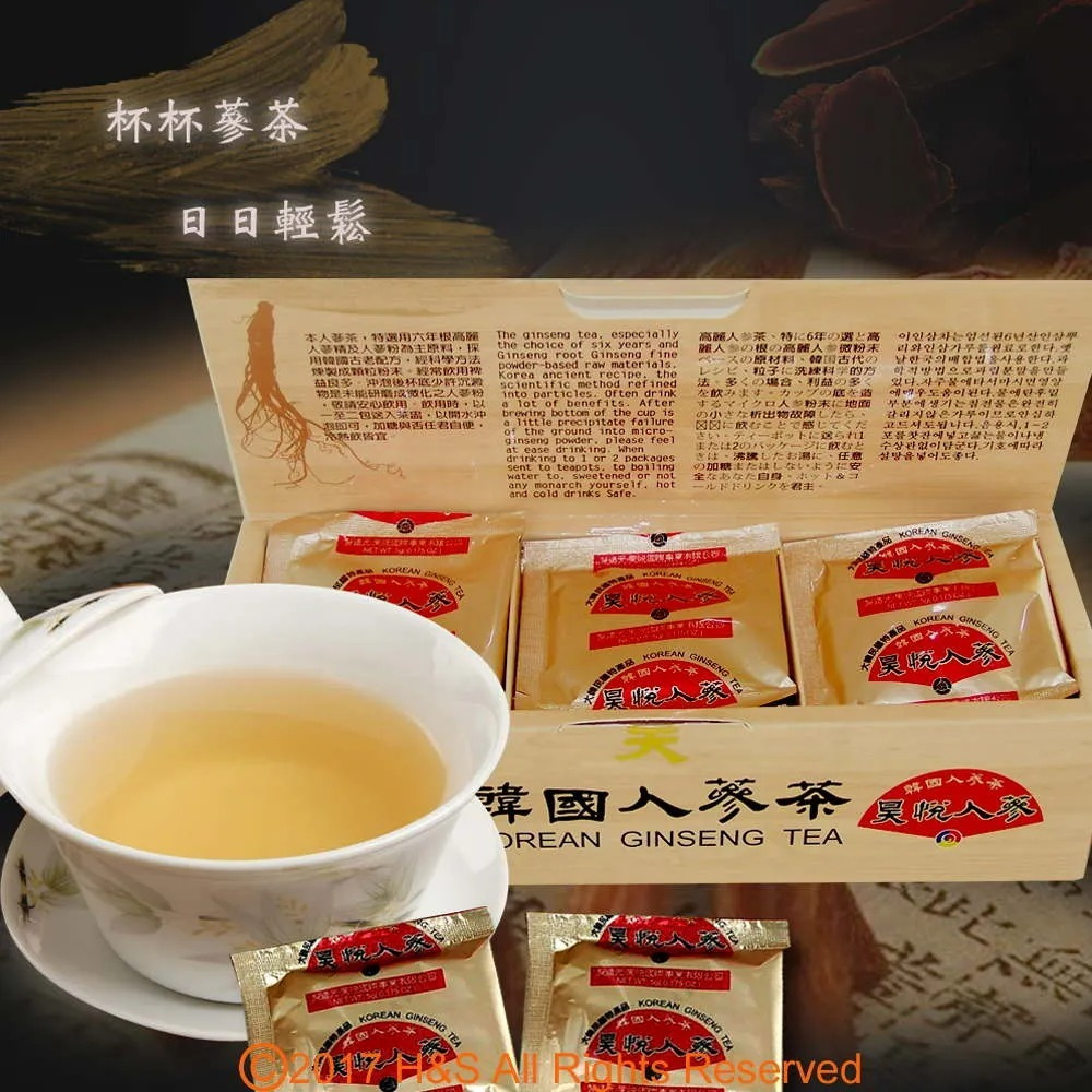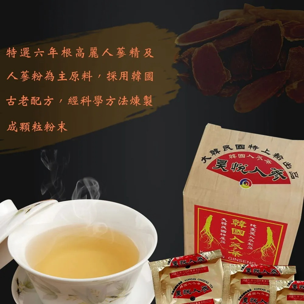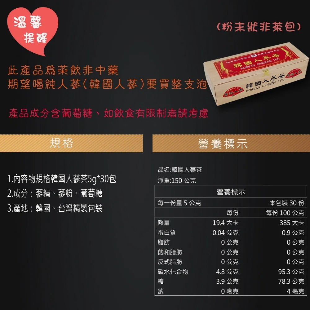 1.內容物規格:韓國人蔘茶5g*30包/盒共2盒 2.成分:蔘精、蔘粉、葡萄糖 3.產地:韓國、台灣精製包裝 4.廠商:瀚軒國際貿易有限公司 5.廠商電話:02-82451347 6.廠商地址:新北市中和區中正路218-7號14樓 7.保存期限:2年 8.本產品已投保責任險:新光產物保險字號:1300-06AKP0000794 9.食品業者登錄字號:F-124728184-00000-