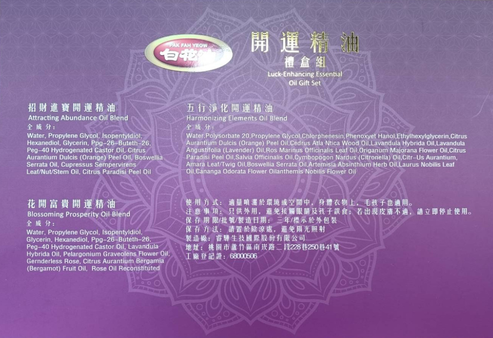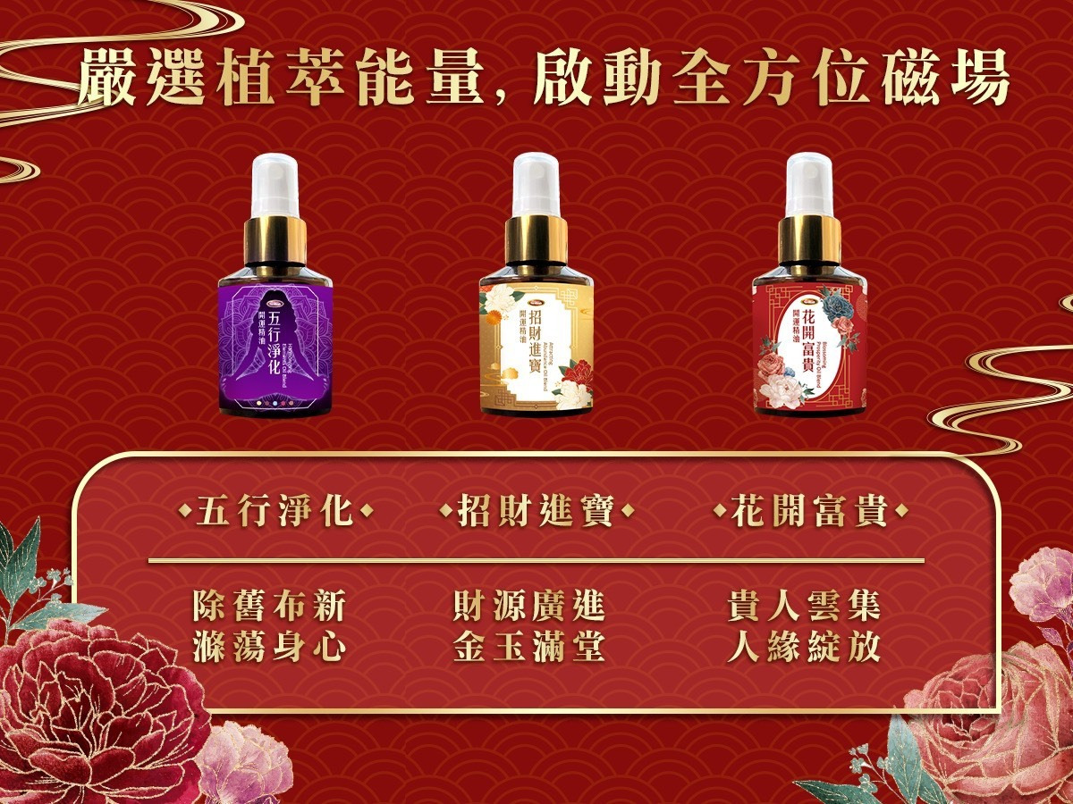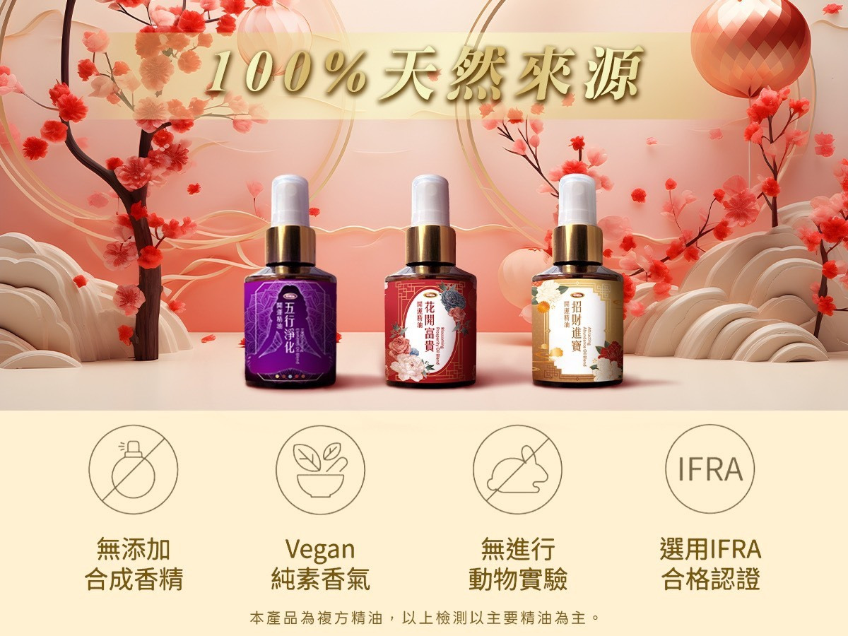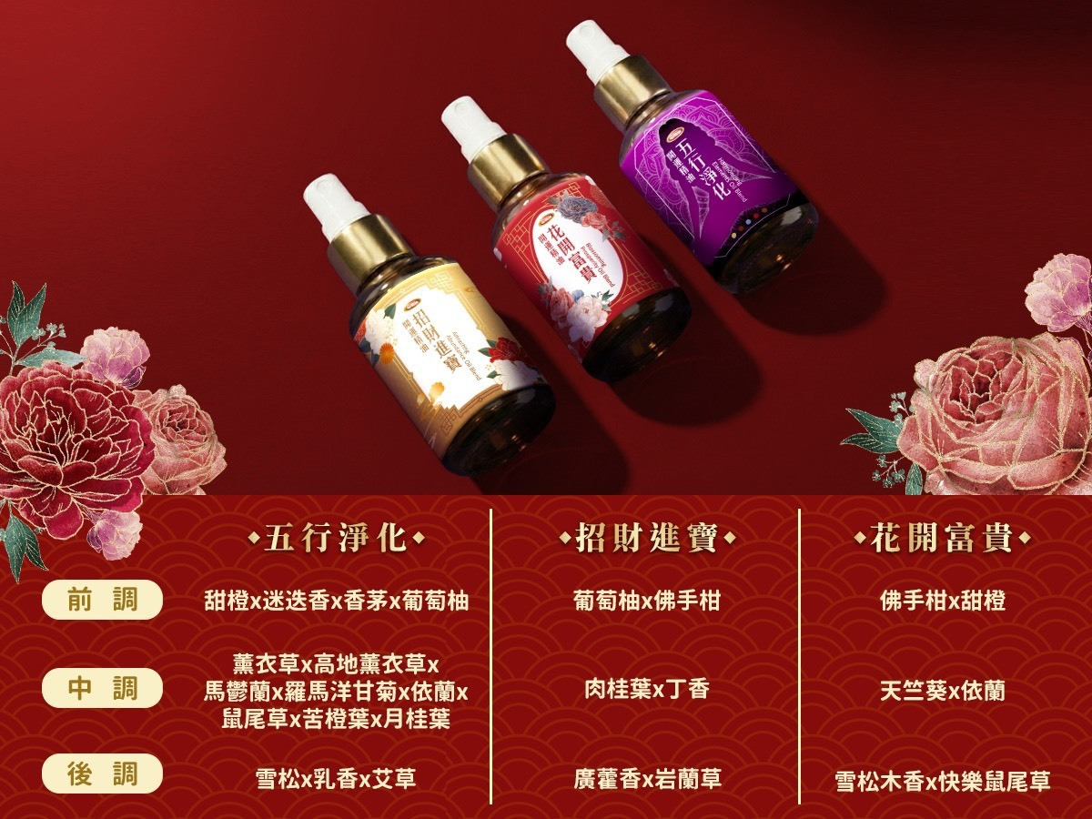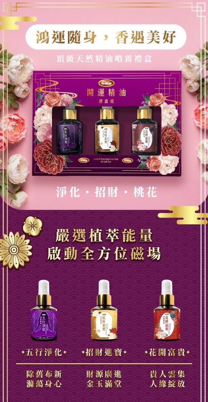 包括招財進寶50ml*1+花開富貴50ml*1+五行淨化50ml*1 三種開運精油