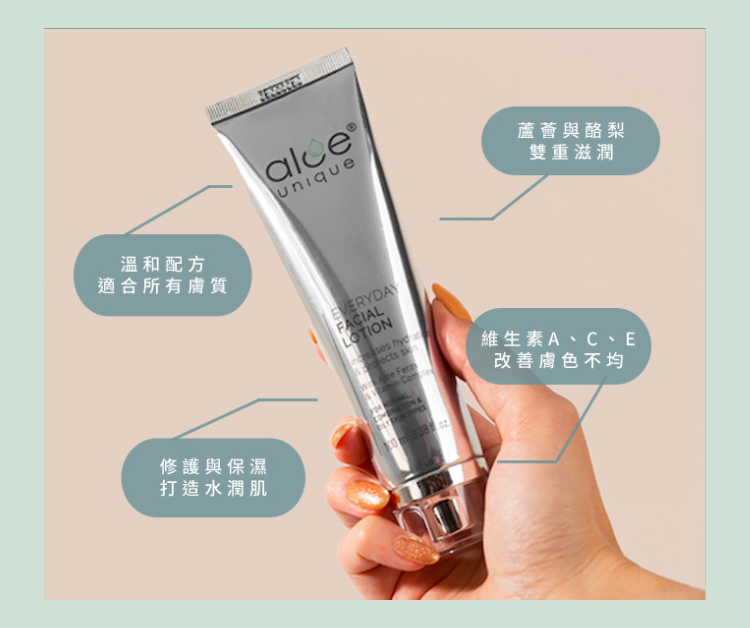 臉部乳液:於清潔後使用,均勻塗抹臉部與頸部。